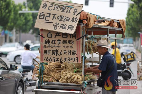 7月19日上午,在南京路与中州路交叉口附近,一名老大爷正在卖粉条,粉条车周围是他自己用毛笔写的广告,简单直接,吸引了不少市民的目光。看到记者拍照,老大爷笑着说:“你给俺也上上报纸,让俺多卖点粉条。”记者 魏文慧 摄
