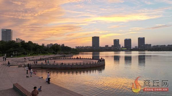 前日傍晚,市民在日月湖畔休闲纳凉。天空的晚霞,如同一幅美丽的油画,铺满半个天空。日月湖水也被染成了一片金黄。夜幕降临,华灯初上,湖面倒映着多彩的灯光,如梦如幻,点缀得夜色更加迷人。记者 魏文慧 摄