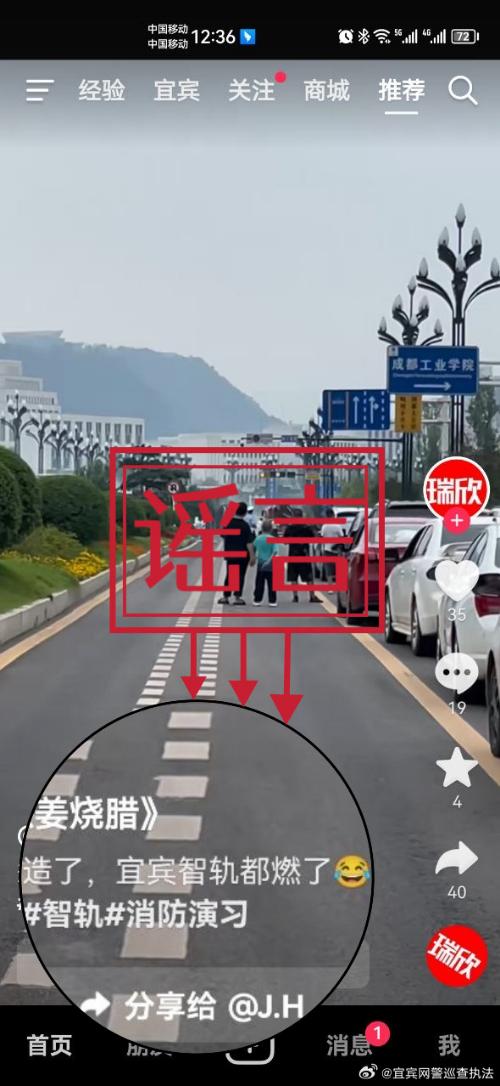 7月21日,四川宜宾网警工作发现,网民邱某在其个人抖音平台发布“着了,着了,智轨都燃了”的视频,引发网民关注和热议,经网安部门和属地公安仔细核查、多方求证,该视频内容为不实信息,依法传唤邱某至公安机关接受调查。经查,邱某为博取关注、获得流量,在明知是消防部门在智轨车站搞演练情况下,拍下视频并称“着了,着了,智轨都燃了”。目前公安机关依法对其进行批评教育和警告,并责令其将视频删除。