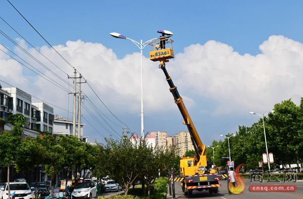 7月31日,国网夏邑县供电公司施工人员在抢修路灯。近几天连续降雨,部分路灯线路短路,技术人员冒高温及时抢修,确保夜间照明。记者 韩 丰 摄