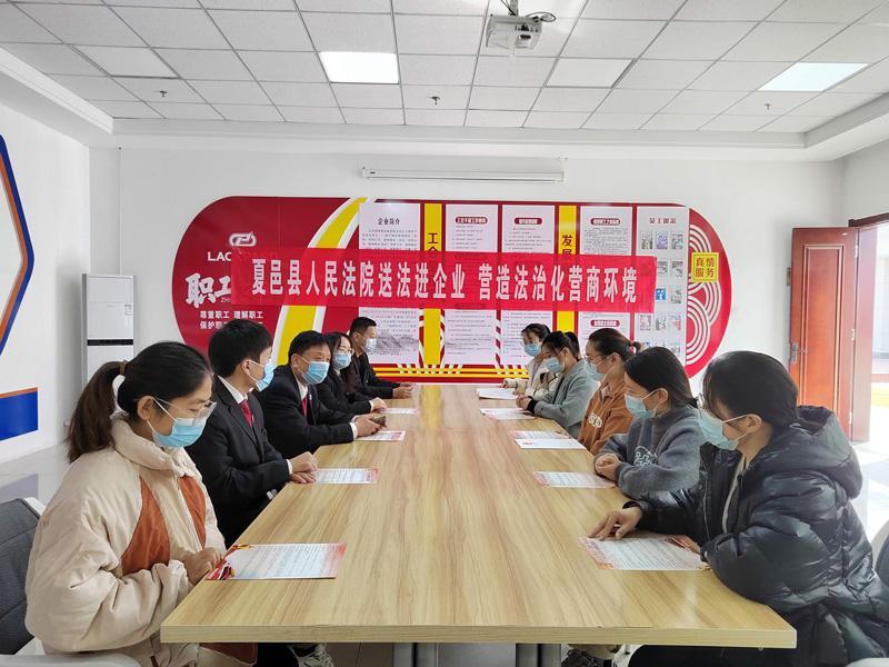 夏邑县人民法院党组书记、院长刘德慧多次到企业走访,开展送法进企业活动,向企业赠送《企业防范法律风险提示100条》《民法典》等法律知识手册,表示将一如既往地为企业发展提供法律支持,帮助企业增强防范法律风险的意识和能力。