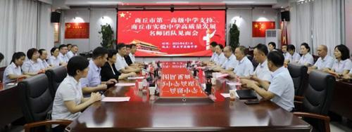 8月1日上午,商丘市第一高级中学支持商丘市实验中学高质量发展名师团队见面会在商丘市实验中学举行,第二批名师团队崔军明、崔苗、王鹏3名教师正式入驻商丘市实验中学。市一高负责人一行,市实验中学负责人和领导班子成员,以及招办、教务、课改部全体教师等参加会议。
