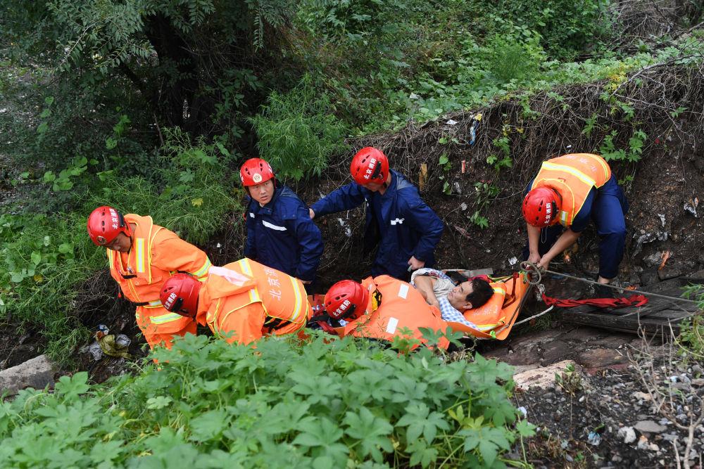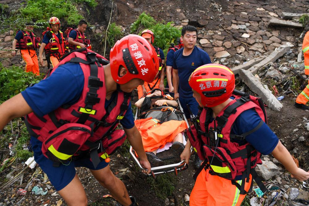 8月1日,在北京市门头沟区水峪嘴村,北京门头沟区消防救援支队的消防员在转运一名受伤村民。新华社记者 鞠焕宗 摄