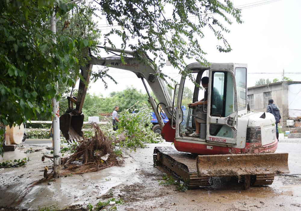 8月1日,在北京市房山区青龙湖镇上万村,工作人员清理倒伏树木。新华社记者 张晨霖 摄