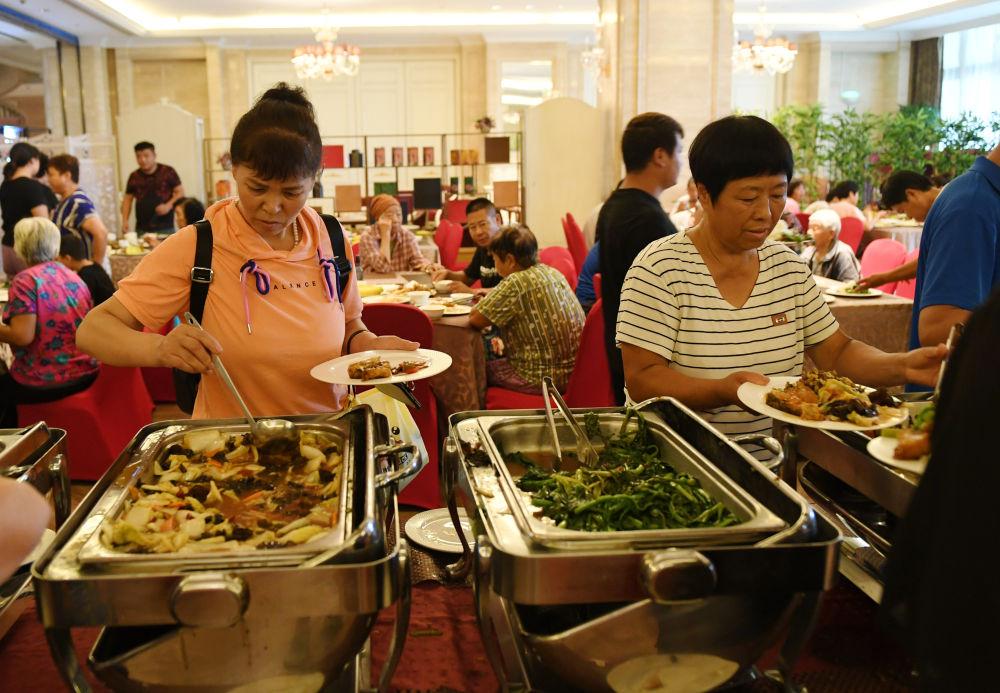 8月1日,北京市房山区青龙湖镇的村民在临时安置点用餐。新华社记者 张晨霖 摄