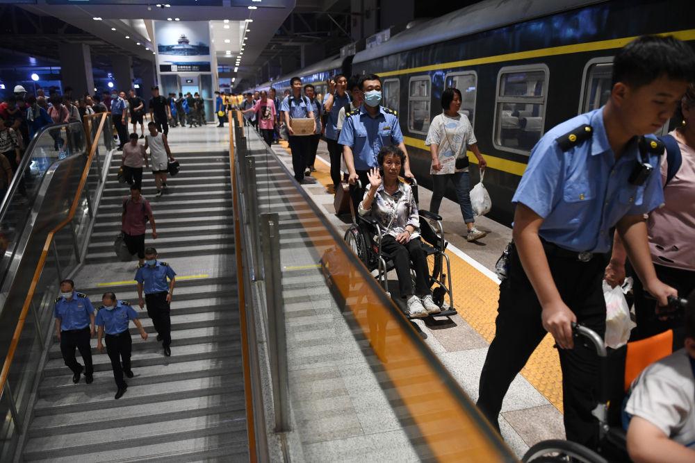 8月3日,K396次、Z180次列车的滞留旅客到达北京丰台站。新华社记者 张晨霖 摄