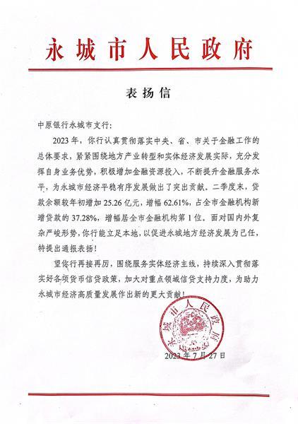 近日,永城市人民政府向中原银行商丘分行永城支行发来表扬信,对其上半年加大信贷投放促进地方经济发展工作给予充分肯定。