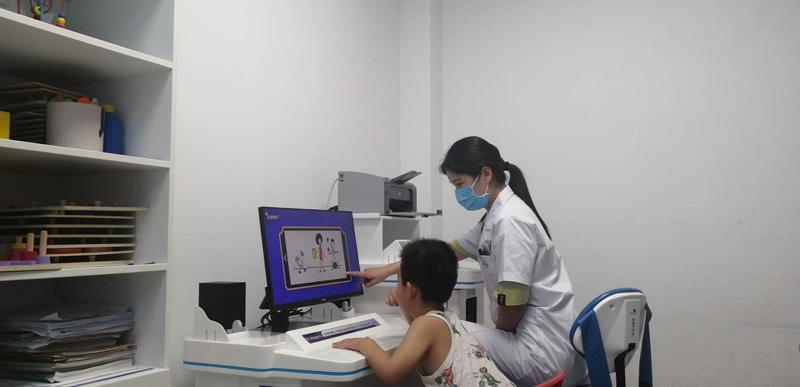 近日,商丘市中医院儿童康复科开展了“多动症治疗夏令营”活动,优先采用非药物治疗的方式,帮助多动症患儿在最短的时间内获得最佳治疗效果。图为医护人员在用治疗机为患儿做语言训练。