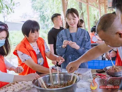 杨曼(左三)在为老人包饺子,举办饺子宴。