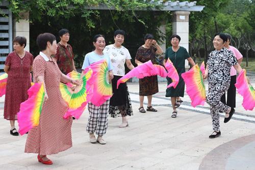 8月15日,柘城县浦东街道办事处丹阳小区夕阳红舞蹈队正在排练节目,准备为乡亲们演出。这支舞蹈队由16人组成,其中年龄最大的80岁、最小的64岁。她们用舞蹈展示着快乐生活,舞出了别样的“夕阳”风采。张书珲 摄