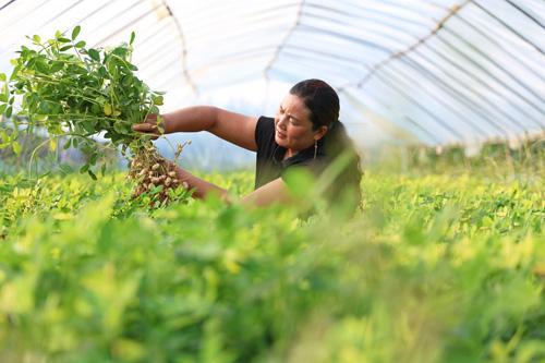 8月14日,柘城县牛城乡后皇村村民皇甫研萍在查看花生长势。立秋后,花生进入饱果成熟期,丰收在即。为提高花生种植技术水平,柘城县农业农村部门积极抓好花生良种和关键技术措施的推广普及工作,为确保春花生丰收打下了坚实基础。张 超 摄