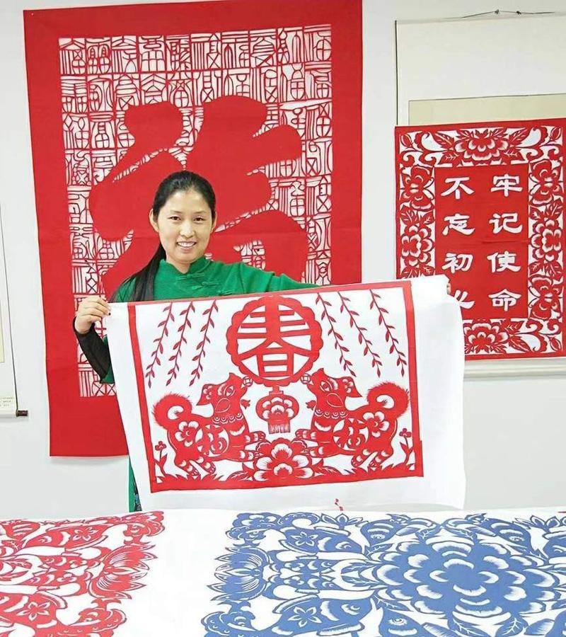 李红玉出身剪纸世家,是民权县非物质文化遗产柯蓝剪纸第四代传承人、中国民间艺术家协会会员、非遗进校园剪纸教师、非遗剪纸传承人。她经常参与各种剪纸交流会、非遗进校园剪纸教学活动,从幼儿园到大学,制定不同的剪纸课程,让学生了解传统文化剪纸并喜欢剪纸。