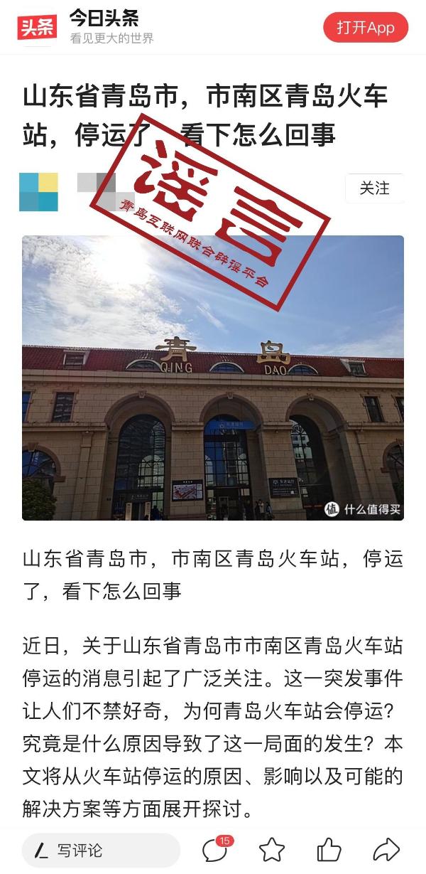 经核实,网传“青岛火车站停运”为虚假信息,中国铁路济南局集团有限公司青岛站已就此内容进行了投诉。