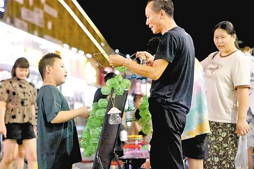 8月19日傍晚,在868创意园内,蝈蝈“唧唧、唧唧……”的鸣叫声吸引了不少儿童的目光。记者在现场了解到,蝈蝈每只15元左右,十分热销。
