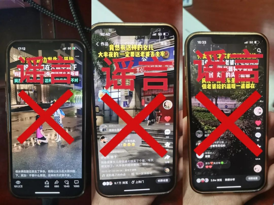 经核实,该视频信息为谣言,系由网民周某某、杨某某、李某某三人策划拍摄的虚构事实。自2023年4月起,三人为吸引流量、赚取经济利益,在多个平台上发布“雨天街面母亲脚踢倒地女儿”、“摩的司机为争抢客人当街拉扯打架”、“在派出所门口女儿拉着母亲说送母亲坐牢”等多条自导自演的虚假视频,恶意散布谣言、混淆视听。
