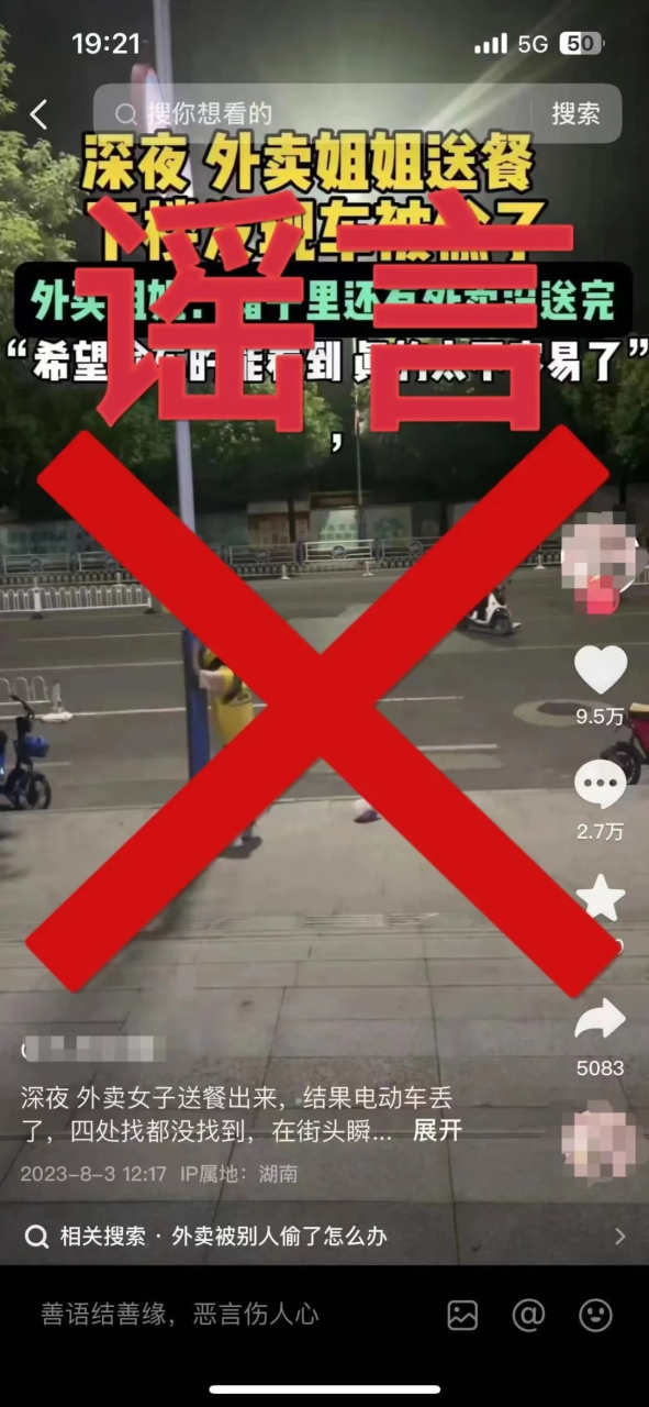 8月4日,湖南怀化市公安局鹤城分局网安大队在工作中发现,配文为“深夜外卖姐姐送餐下楼发现车被偷了”的短视频在抖音中广为流传,引发网民热议,扰乱社会公共秩序,造成不良影响。