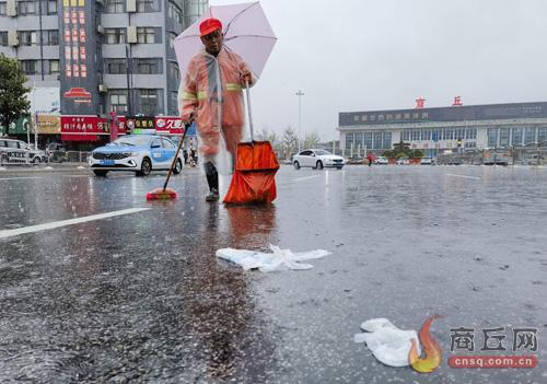 8月27日上午,在商丘火车站南侧,一名环卫工人打着伞在雨中打扫垃圾。记者在附近看到,个别司机随意往车外扔垃圾,不但影响市容,也不文明。本报融媒体记者 魏文慧 摄