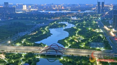 8月25日,夜幕降临,华灯初上,示范区内的日月河景区灯光勾勒出了一幅雅致、静谧、和谐的美丽画卷,成为市民傍晚休闲的好去处。本报融媒体记者 崔 坤 摄