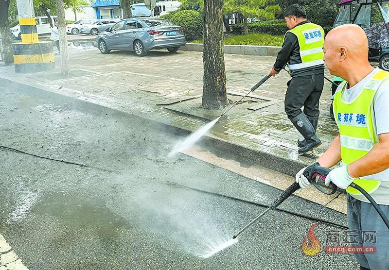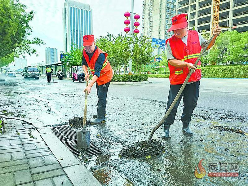 8月28日上午,环卫工人正在神火大道旁清理淤泥。市区遭受强降雨后,路面上堆积了厚厚的淤泥,严重影响市民出行及正常交通秩序。记者看到,环卫工人采取人工与机械相结合的作业方式清扫道路,以最快时间恢复路面原貌。