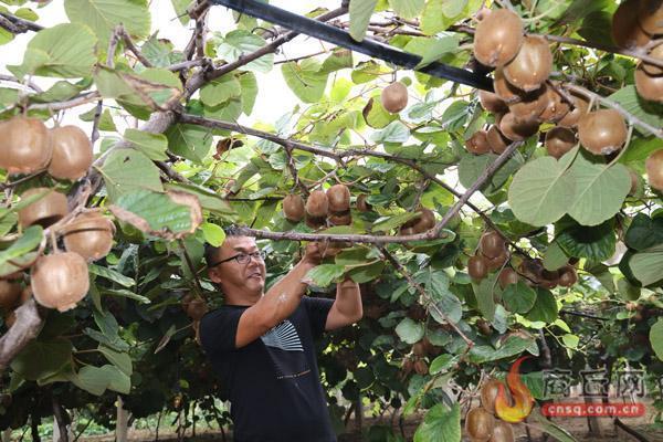 8月29日,睢阳区冯桥镇李楼村猕猴桃种植基地,一颗颗鸡蛋大小的猕猴桃挂在枝头,村民李海涛正忙着采收,供应市场。 记者 邢 栋 摄