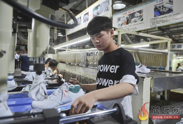 9月4日,工人在运动鞋生产车间作业。睢县嘉鸿鞋业总投资6亿元,拥有10条成型生产线,主要生产足力健、361、思凯捷等国内外知名品牌产品。记者 崔 坤 摄