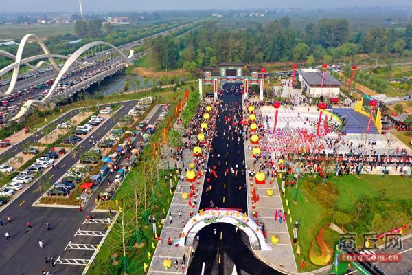 9月10日,航拍宁陵中华梨源景区。在新落成的宁陵中华梨源,古香古色的亭台,雕梁画栋、巍峨矗立的牌坊与对面蜿蜒迤逦的彩虹桥交相辉映,构成一幅唯美的画面。记者 高会鹏 通讯员 吕忠箱 摄