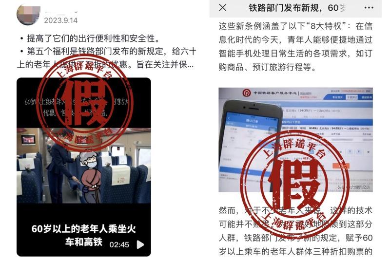 中秋国庆假期临近,不少网络平台流传“从2023年10月1日起,60岁以上老年人乘火车可以享受5折优惠”等说法。上海辟谣平台也收到粉丝留言,问是不是真的。对此,记者联系国铁集团求证获知,该说法是假的,没有此项规定。铁路部门只提供了面向儿童、学生、残疾军人、残疾旅客的票价优惠政策。