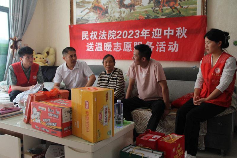 9月22日,民权县人民法院开展迎中秋送温暖志愿服务活动,组织志愿者看望慰问孤寡老人和困难家庭,给他们送去节日的温暖。 通讯员 李宁 摄