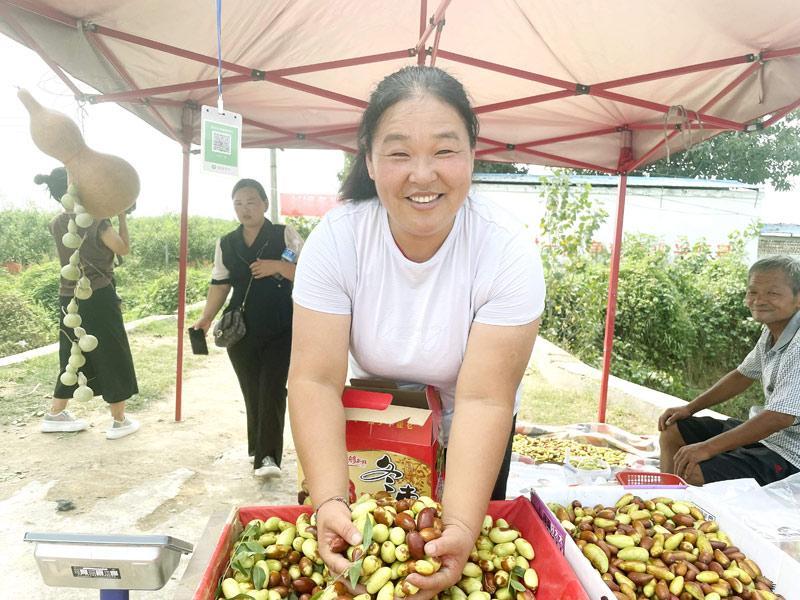 10月6日,民权县北关镇刘楼村冬枣采摘园迎来丰收,种植户刘迎春正在售卖冬枣。据悉,刘迎春承包50余亩地,种有冬枣、子弹头等多种枣类,市场价10元一斤,每亩收入5000多元。 本报融媒体记者 闫鹏亮 摄