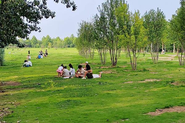 游客在恒山湖湿地公园草坪上休憩。 记者 黄业波 摄
