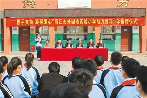 10月18日上午,商丘市外国语实验小学为睢阳区古宋街道办事处堤口小学捐赠多媒体教学设备12套和崭新的课桌120套,改善办学条件,助力学校发展。