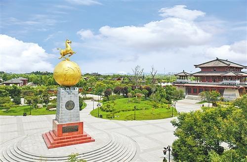 位于商丘火文化景区旁的中国优秀旅游城市雕塑“马踏飞燕”。记者 魏文慧 摄