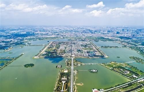 秋高气爽,秋色宜人。清晨初露的朝阳,在日月湖清澈广袤的湖面上镶嵌出淋漓波光,晨练的市民在此尽享安逸而美好的生活。