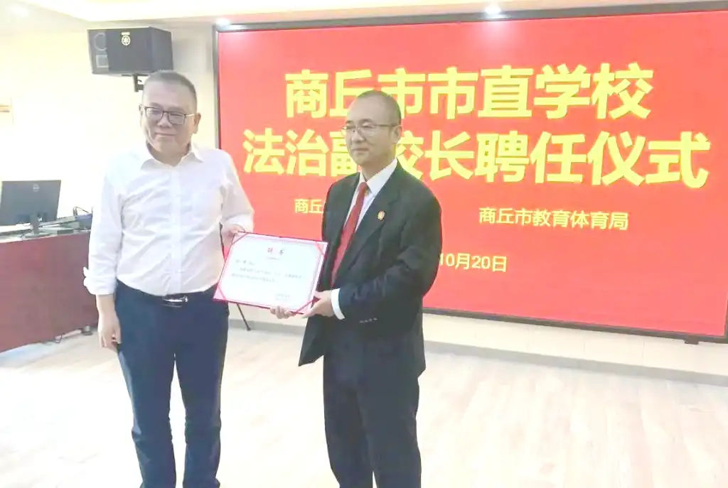 10月20日下午,商丘市第一中学在新校区举行“秋季第一堂法治系列讲座”网络直播普法教育活动暨市直学校法治副校长聘任仪式。该校副校长薄延东为商丘市中级人民法院法官程伟颁发了法治副校长聘书。
