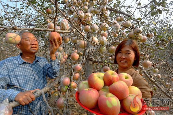 10月30日,宁陵县乔楼乡秋硕农业种植合作社苹果种植基地,果农们忙着采摘、运输苹果,游客沉浸在美景中,乡村田野一派喜人的丰收景象。