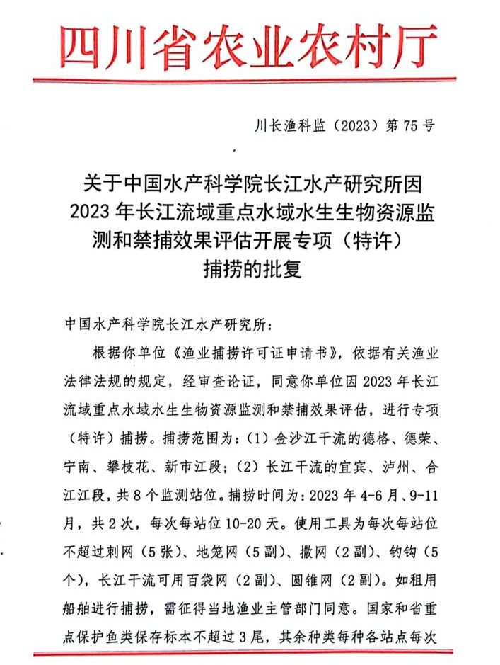 关于中国水产科学院长江水产研究所因2023年长江流域重点水域水生生物资源监测和禁捕效果评估开展专项(特许)捕捞的批复