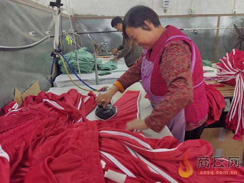 与当店王村村委会一墙之隔的商丘市文斌服装有限公司生产车间内更是红红火火,几十台机器有序排列,工人们正忙着赶制一批羽绒服。
