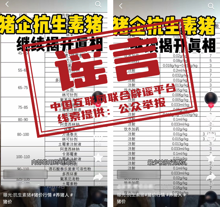 近日,有网民在某视频类社交平台发布视频称,“某生猪养殖企业140天饲养周期内用34种抗生素”,引发网民关注。对此,中国互联网联合辟谣平台向有关主管部门核实查证,证实视频中宣称的“生猪养殖环节滥用抗生素”等信息为虚假信息。