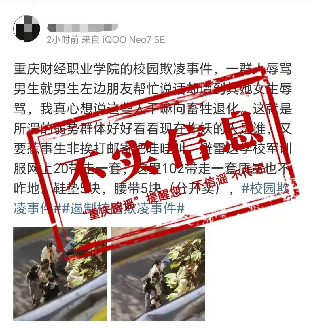 该网传信息称“重庆财经职业学院的校园欺凌事件,一群人辱骂男生,男生左边朋友帮忙说话却遭到其他女生辱骂......”经向永川区高新区管委会、重庆财经职业学院核实,该信息为不实信息,发帖人将学生间嬉戏打闹误以为争吵欺凌。目前,发帖人已主动删除相关不实帖文。
