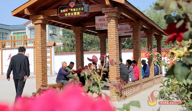 初冬时节,阳光和煦。走进宁陵县华堡镇楚堂村,穿过绿树红花掩映的村道,顺着“葫芦”形状的一塘碧水往西直行,村文化广场便映入眼帘。在广场东侧,月季花衬托下的一个红砖结构亭廊分外显眼,“楚堂村‘有事好商量’协商议事廊”的牌子高高悬挂。亭廊下,20余位村民正在热议高标准农田打井项目的选址与监督工作,现场气氛紧张而热烈。