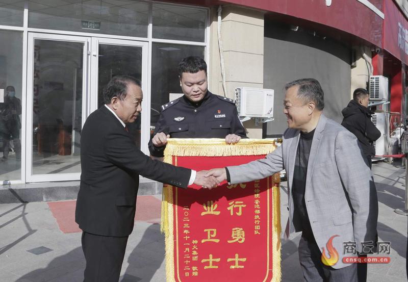 11月24日,河南神火集团有限公司为梁园区人民法院执行局送来写有“企业卫士、执行勇士”字样的锦旗,以表达感谢之情。不久前,该院法官、干警在一起租赁合同纠纷案的执行中,多次实地走访,研判案情,取得了良好的法律、社会效果。 本报融媒体记者 石 松 摄