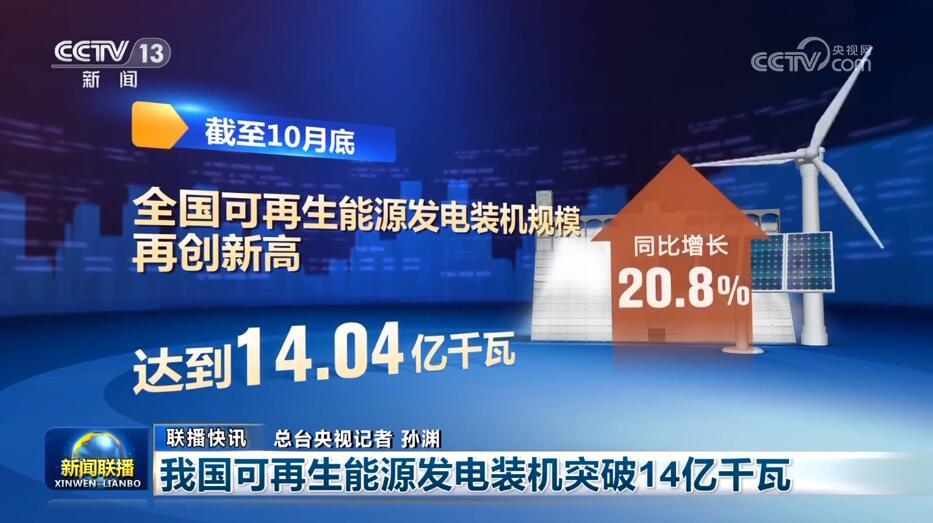 国家能源局发布数据显示,截至10月底,全国可再生能源发电装机规模再创新高,达到14.04亿千瓦,同比增长20.8%,约占全国发电总装机的49.9%。