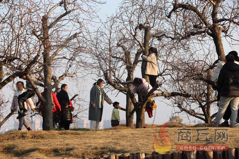 前日下午,在商丘古城北门外的湖心岛上,市民带着孩子在景观树旁游玩。记者在现场看到,有的孩子爬到了树顶,有的骑在树杈上,周围都是树枝,容易伤到孩子,希望市民不要让孩子攀爬景观树,以免孩子受伤。
