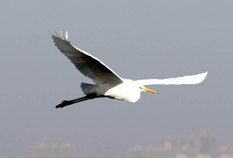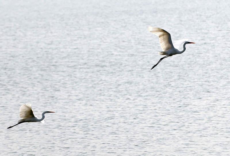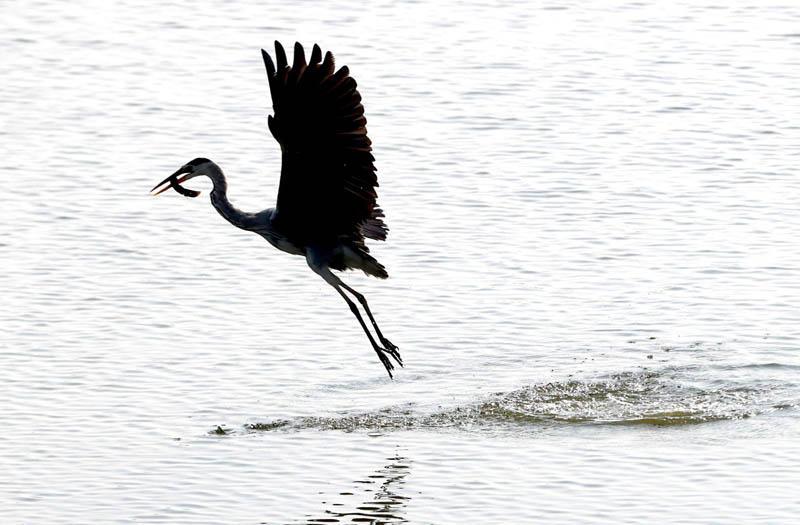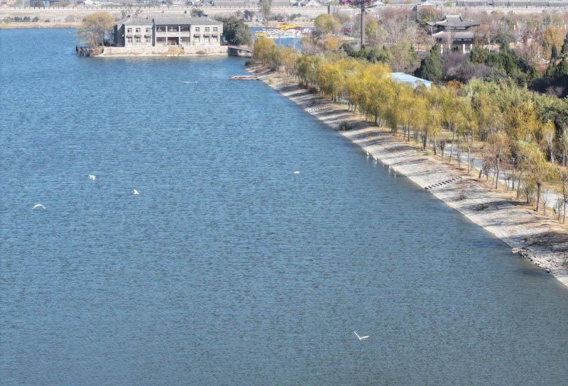 12月7日上午,商丘古城南湖,成群的鸟儿或展翅翱翔,或悠然戏水,吸引不少游客围观。