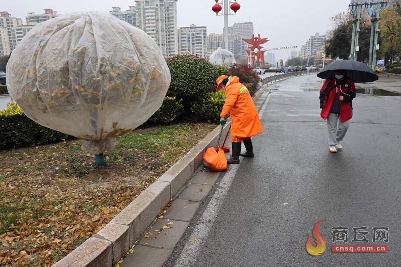 12月10日,在神火大道与南京路交叉口东南角,环卫工人正在打扫地面上的落叶。当日气温骤降,市内个别绿化树被裹上了一层塑料布保暖。记者在街头发现,由于落叶较多,很多环卫工人从早上一直忙到中午。
