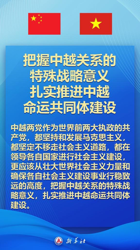 两位总书记都认为,中越作为友好近邻,理想相同,理念相通。作为好邻居、好伙伴、好兄弟、好同志,中越构建具有战略意义的命运共同体具有天时、地利、人和的独特优势。双方应该继承老一辈领导人缔结的传统友谊,共同努力构建命运共同体,走好各自的现代化道路,实现互利共赢、美美与共,造福两国人民,也为地区和平与繁荣作出积极贡献。