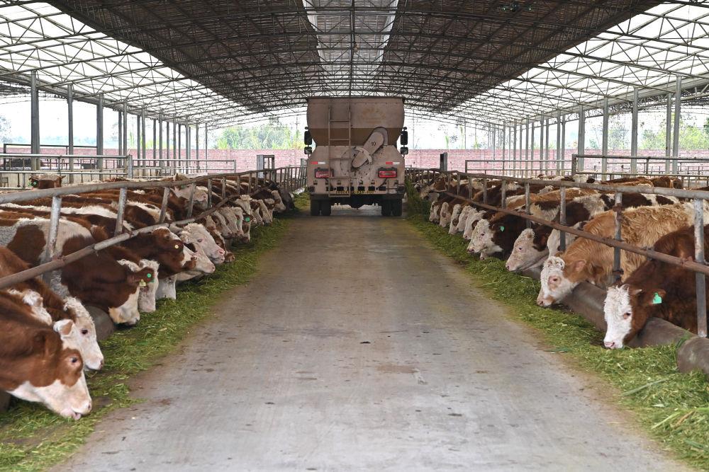 12月13日,在来宾市兴宾区大湾镇双诚牧业有限公司,工人驾驶车辆给牛投撒以甘蔗尾叶为主要原料的饲料。