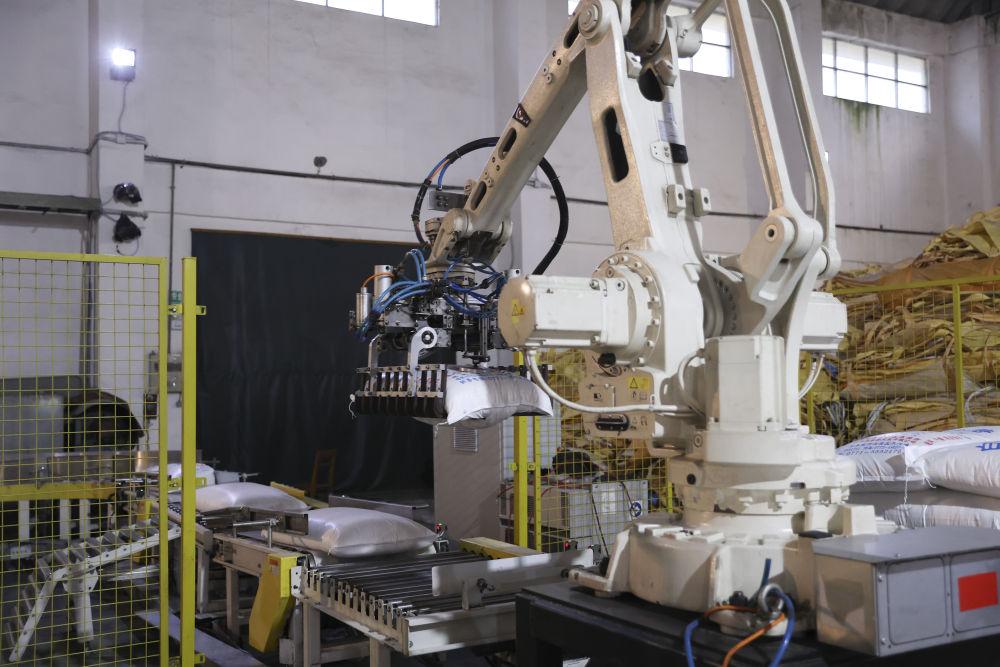 12月14日,在广西来宾东糖凤凰有限公司,机械臂在厂房码放白砂糖成品。