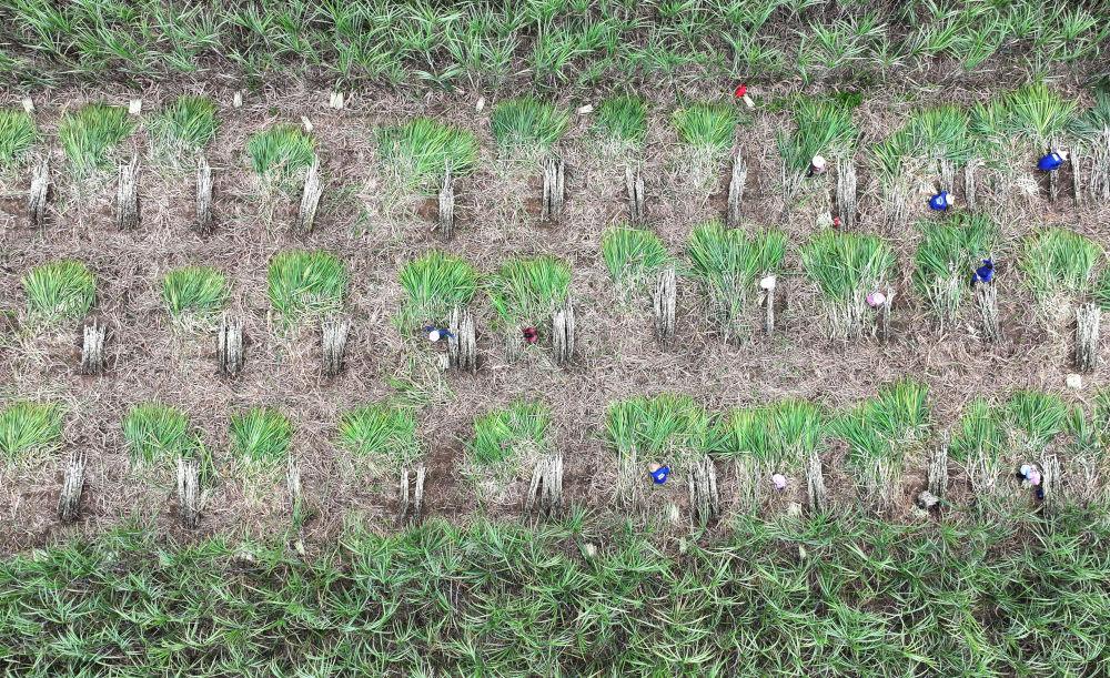 12月12日,在来宾市兴宾区小平阳镇,农民在收割甘蔗(无人机照片)。