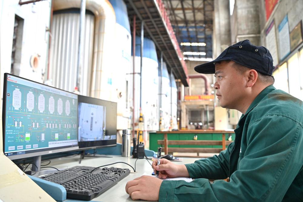 12月12日,工作人员在广西来宾小平阳湘桂制糖有限公司监控蒸发系统。